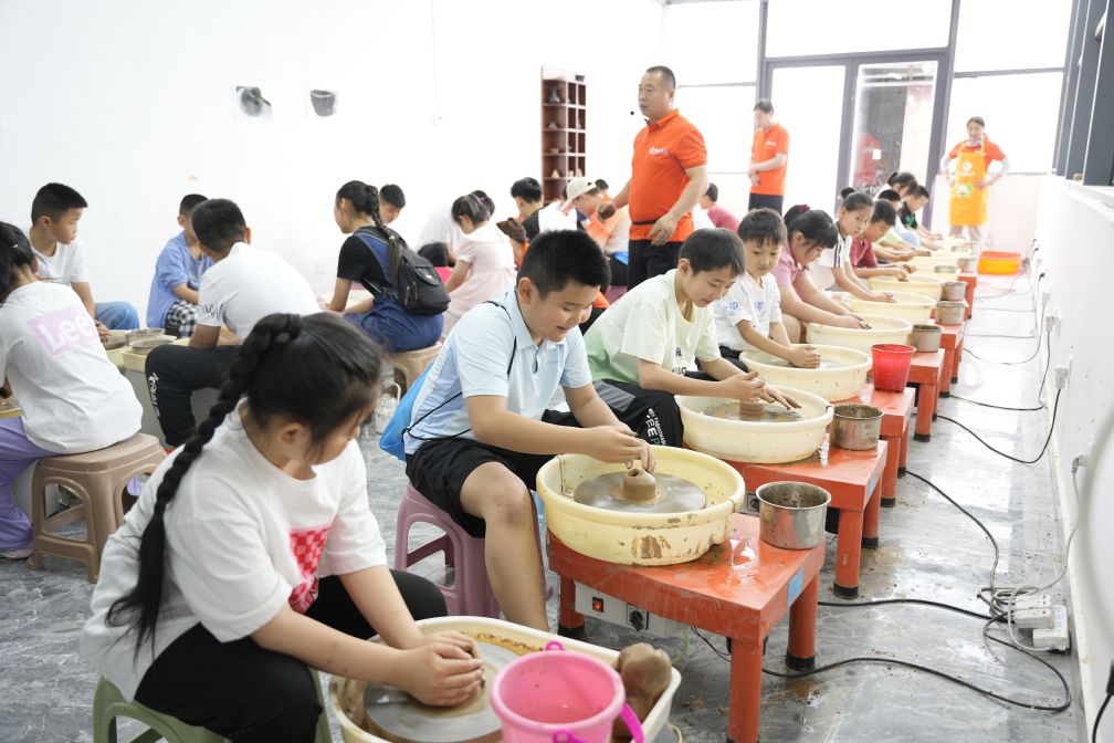 品嘗完糖酥棍后,孩子們緊接著來(lái)到了省級(jí)非物質(zhì)文化遺產(chǎn)——龍格黑陶藝術(shù)研究院。走進(jìn)黑陶工坊,迎面而來(lái)的是泥土與時(shí)間交織的香氣。在這里,孩子們跟隨徐慶增老師,認(rèn)真聆聽(tīng),用心觀察了展館內(nèi)的一眾黑陶藝術(shù)品。隨后,孩子們?cè)谛炖蠋煹闹笇?dǎo)下親身體驗(yàn)了拉坯、泥條盤(pán)筑等黑陶工藝,孩子們興致勃勃。很多孩子是第一次制作黑陶,雖然手法不夠嫻熟,但在老師的指導(dǎo)下,漸漸地做得有模有樣了。通過(guò)親身參與制作黑陶的過(guò)程,充分體驗(yàn)到了動(dòng)手制作的樂(lè)趣,更加深刻地了解了黑陶文化的發(fā)展歷程及文化內(nèi)涵。